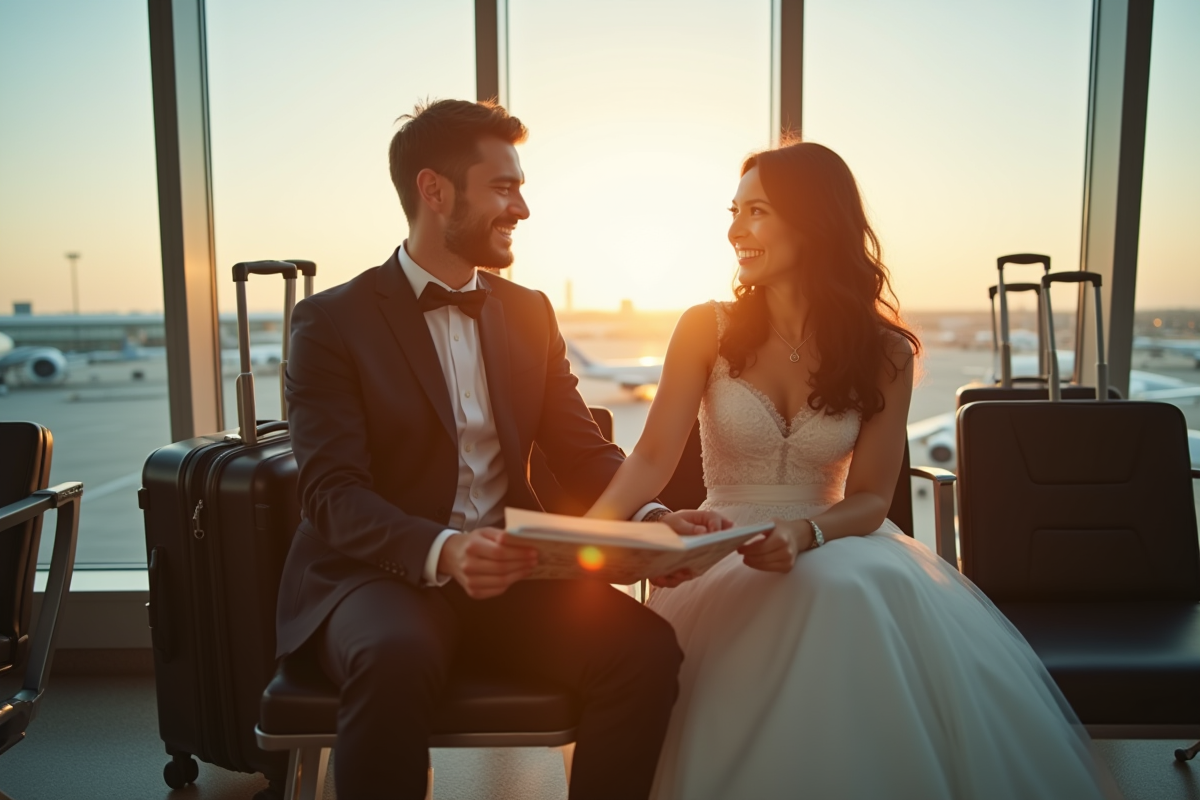 Jeune couple marié à l'aéroport avec bagages et brochures de voyage