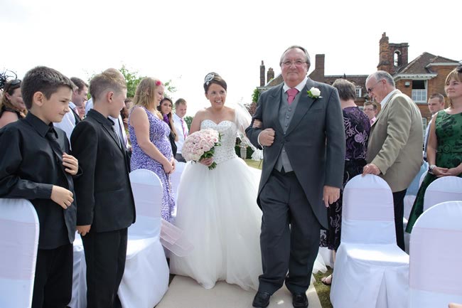 Dans la tradition britannique, la mariée avance à la droite de son père, tous deux ouvrant la procession. Derrière eux, les demoiselles d’honneur et les garçons d’honneur ferment la marche. Certains couples bousculent cet ordre, préférant voir les demoiselles d’honneur ouvrir la voie. Une façon d’ajouter un peu de suspense et d’offrir à la mariée quelques secondes de calme, main dans la main avec son père, juste avant le grand moment.